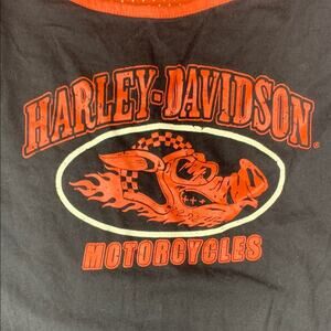 Bold Harley-Davidson tank with striking logo. Black base with vibrant orange accents.
