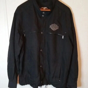 Harley Davidson women's large Nylon jacket. it has some cracked of material inside of jacket ..zipper it's hard to zip up. but they have snap buttons that makes the jacket look great. measurements are provided in pictures they are approx n are taken flat lsy.............1969