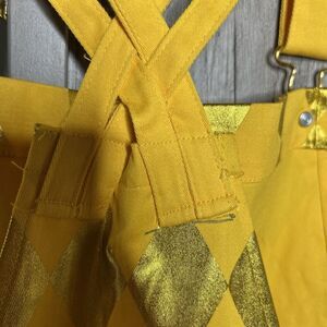 These are Harley Quinn Birds of Prey overalls by Her Universe in size medium. The overalls feature an argyle/diamond pattern in yellow with a sleeveless design. Made of polyester, they are inspired by the character Harley Quinn, perfect for a casual occasion or costume theme. The brand is Birds of Prey, and the style is overall.