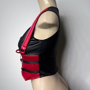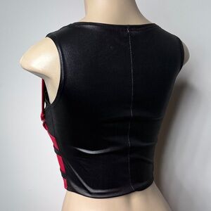 Bold crop top with lace-up front. Features striking red and black design. Ideal for casual outings.