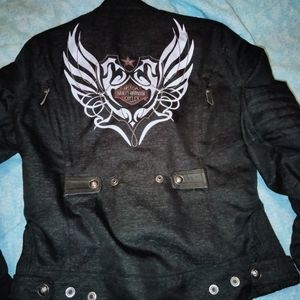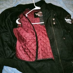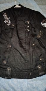 A one of s kind jacket very unique in style inside liner removes for a lightweight vest all zippers buttons snaps are intact and work properly no stains rips or tears excellent condition 93% polyester elbows do have padding as well as excellent jacket for All seasons back logo is a silver tube gray color also known as the reflective logo