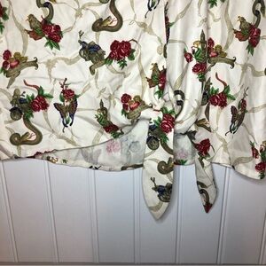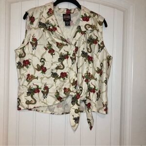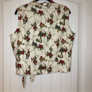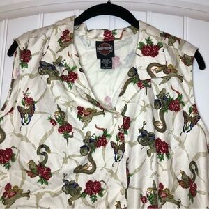 Harley Davidson 100% Silk Snake & Roses Sleeveless Crop Top & Pant. The top is is a button down, with a twist tie on the side. As shown in photos above. The bottoms have an elastic waist. The size tag for the bottoms say 16. It is listed as an XL (the top is listed as an XL). As shown in photos above. In great preowned condition. No visible signs of wear. Feel free to make a reasonable offer through the offer button!