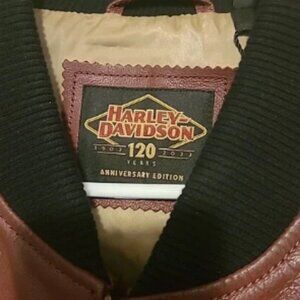 Upgrade your wardrobe with this Harley-Davidson 120th Anniversary Men's Leather Jacket in a stylish dark red color. This lightweight jacket features a full zip closure, embroidered logo, and multiple pockets for your convenience. The bomber style jacket is made of high-quality leather and polyester lining and insulation, making it suitable for all seasons, especially fall, spring, and winter.