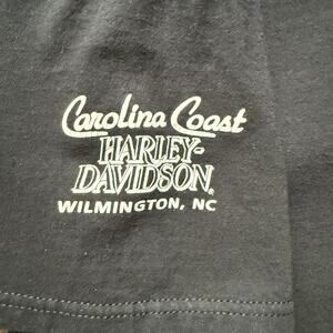 Vintage 1999 Harley-Davidson henley pocket t-shirt in black. Features the iconic Harley-Davidson logo patch printed on the front pocket, three-button henley neckline, and a Carolina Coast Harley-Davidson Wilmington, NC graphic on the sleeve.