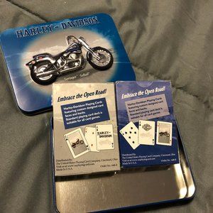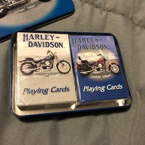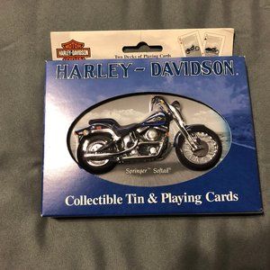 Harley-Davidson playing cards. Set of 2 in tin case. Features the Springer Softail from 1988. Cards are still in original wrapping - never used.