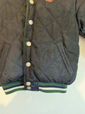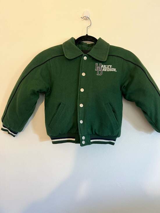 Vintage Harley-Davidson Kids Reversible Varsity Jacket, Forest Green Wool & Quilted Black, Size 7. This versatile jacket features two distinct looks in one. The green side is a heavy wool-blend with collegiate-style embroidery and large back patch, while the reverse side is a black diamond-quilted shell with a motorcycle graphic on the back.