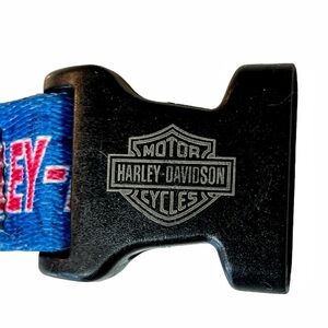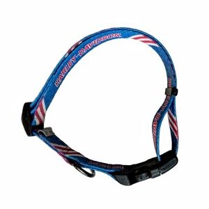 Harley-Davidson nylon dog collar in Blue with Red Harley-Davidson writing & logo throughout the collar. Black hardware. Adjustable length to 26 inches long