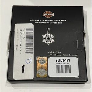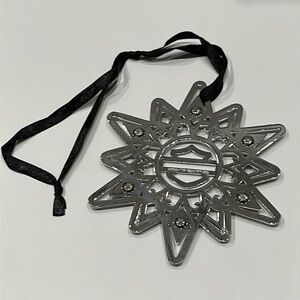 Harley-Davidson Bar & Shield Star Rhinestone Holiday Chrome Plated Ornament. Bar & Shield logo inside star with rhinestone embellishment. Measures 4". Minor signs of use. No notable flaws.