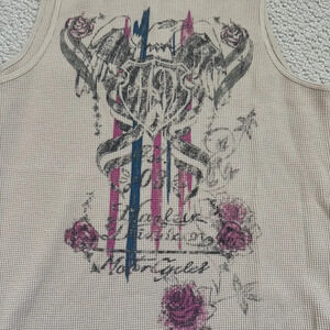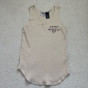 Beige waffle knit top with Harley-Davidson emblem. Perfect for casual wear.