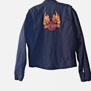 Experience the iconic style and quality that Harley-Davidson is known for with this authentic black jacket featuring striking flame embroidery. Designed to complement any outfit, this jacket boasts a comfortable fit perfect for casual rides or spirited evenings out. Crafted with attention to detail, it includes practical zipper pockets for convenience and is manufactured in China to Harley-Davidson's high standards of craftsmanship. Embodying the spirit of the open road, this large jacket is an essential addition for any enthusiast's wardrobe.   Very good condition.