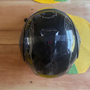 HARLEY DAVIDSON full face motorcycle helmet.  There’s a piece at the top that has a piece missing and holding in place with black tape.  Hardly noticeable.   Don’t know much about that piece.  Interior is excellent, while exterior is decent.  Size M.
