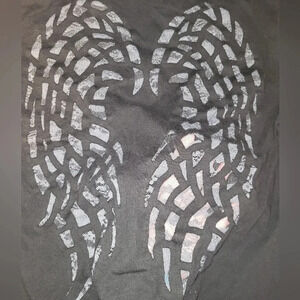 Pre-owned and in good condition with gentle wear. 100% cotton. The gray lacy wings are semi sheer. My hand is underneath in one picture to illustrate. Silver glitter Harley Davidson motif on front.