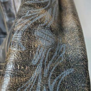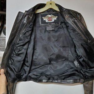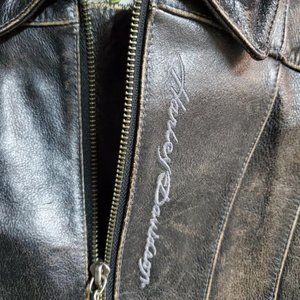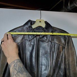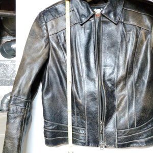 Sleek black leather jacket. Features zip closure. Classic design with structured fit.
