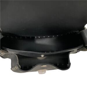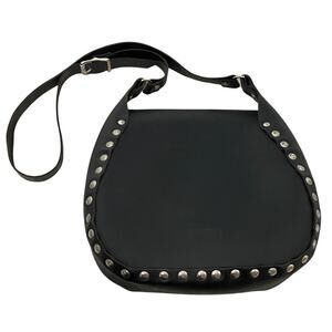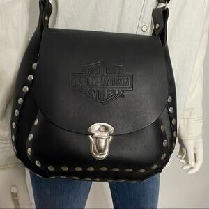 Genuine black leather Harley-Davidson crossbody bag. Saddlebag style. Silver studding throughout. Adjustable strap. 2 compartments in bag. The smaller one has a snap closure.