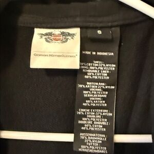 Sleek black jacket with embroidered logo. Features zip closure and stylish design. Very fitted. Zip out hoodie vest with logo. Size small