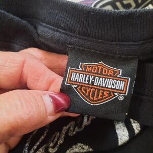 Classic black tee with bold white Harley-Davidson graphic. Short sleeves. Perfect for casual outings.