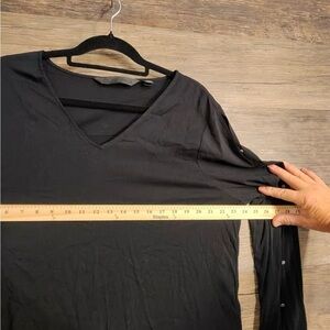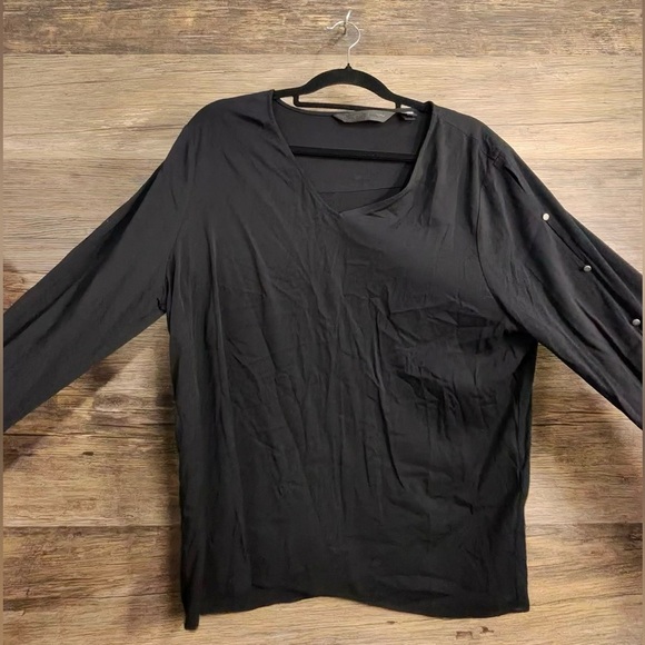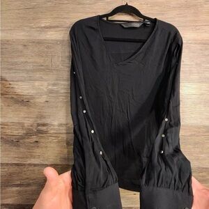 Chic black blouse with V-neck design. Features long sleeves with button details. Ideal for casual or dressy looks.