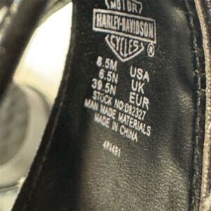 Edgy Harley-Davidson platform wedge sandals in black with studded details and silver-tone buckle accents. Great for biker style or Y2K revival looks.