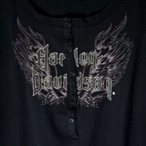 Very cute Women's Harley Davidson black collard Henley with stitching around the lettering. Features a scoop neck and 5 button placket. Size 1W -18 {Plus size- see chart in photos for sizing.} Be sure to check measurements as this brand usually runs small. Pre-owned in great preloved condition. Approx. measurements: PTP 29" Length 26"