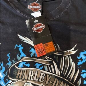 Embrace the iconic style of Harley-Davidson with this striking black and blue short sleeve tee. Featuring a bold skull design with intricate blue accents, this shirt offers a perfect blend of edgy and stylish. Crafted for comfort, it's an ideal choice for casual outings or showcasing your adventurous spirit.