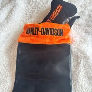 Charming Harley-Davidson holiday stocking with Plush dog bone. Features bold black and orange colors. Perfect for fans and collectors. Dog lovers.