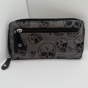 Sleek Harley-Davidson women’s wallet. Black and silver design. Features metal plate and eyelets, and skulls on both the exterior and interior. Excellent Used Condition! Multiple interior pockets: card holders, cash slot, and a zipper pocket. One zipper pocket on the exterior.