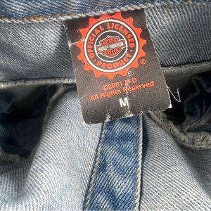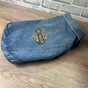 Stylish denim dog jacket with Harley-Davidson logo. Perfect for pet fashion enthusiasts.
