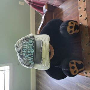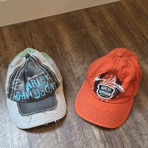 Pair of Harley-Davidson women's caps. One features a distressed gray design with blue text and a little bling. The other is a bold orange with a classic Harley logo patch, embroidery and a little bling.