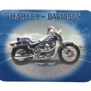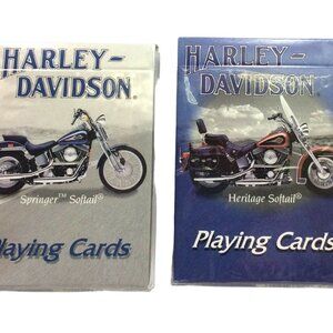 This Harley-Davidson collectible tin includes two decks of playing cards featuring the Springer and Heritage Softail motorcycles. Great for enthusiasts.