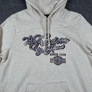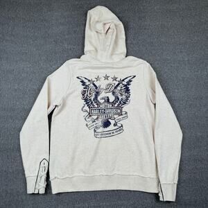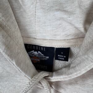 Cozy cream hoodie with bold black Harley-Davidson graphics. Features a front pocket and drawstring hood. Too small for me so I’m letting it go! It’s super condition!
