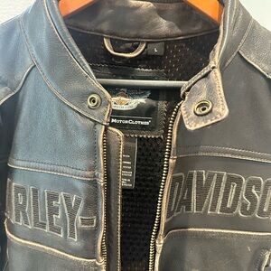 Dark brown leather jacket with bold Harley-Davidson logo. Features snap collar and zip closure.