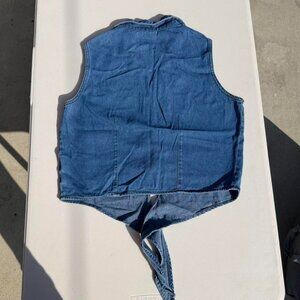 Harley-Davidson sleeveless denim vest with a front tie detail and embroidered Harley logo on the chest.
