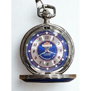 The bold dial showcases a classic Harley chopper against a Stars & Stripes backdrop, complete with the iconic Harley-Davidson bar & shield logo. Framed in chrome with a blue enamel accent ring, this pocket watch is as striking as the motorcycle it celebrates.