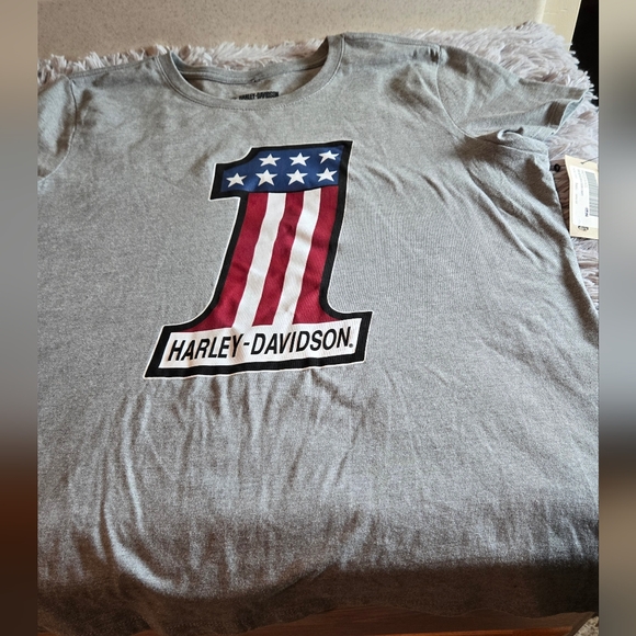 Gray t-shirt featuring a Harley-Davidson graphic with red, white, and blue accents.