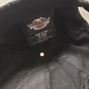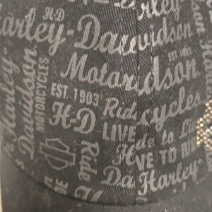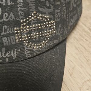 Stylish gray cap with Harley-Davidson script. Features a sparkling rhinestone logo. Perfect for fans.