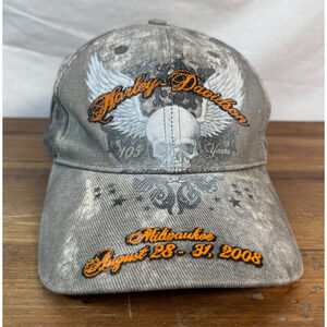 The cap also features embroidered script reading “Milwaukee August 28–31, 2008”, adding a collectible element tied to Harley-Davidson’s heritage.