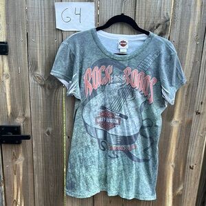 Green tee with Harley-Davidson logo and 'Rock & Roads' design. Bold and stylish.