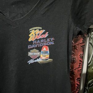 Authentic Harley-Davidson tee from Key West, Florida Classic black v-neck with front + back graphics Soft cotton fabric with a relaxed fit Short sleeves — perfect for warm weather or layering Excellent preowned condition