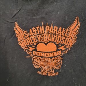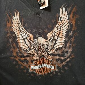 Experience the iconic style of Harley-Davidson Ladies V-neck black graphic short sleeve t-shirt. Featuring a bold eagle design, this shirt is perfect for any motorcycle enthusiast. From Zips 45th parallel Gaylord, Michigan