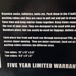Harley-Davidson 4 pc Clear Packing Cubes Style #99619 Clear/Canvas sides w/logo, zippered, 2 large cubes 15" x 12" x 3.5" and 2 smaller cubes 9.5" x 8" x 3". Each piece has front and back see through waterproof PVC. Organize socks, toiletries, shirts, etc. Designed to be used with any Harley-Davidson piece but can easily be used for luggage and duffels. Easy to clean. NWT Unisex.