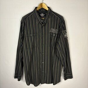 This Harley-Davidson shirt combines a classic black and gray striped pattern with a casual button-down style, perfect for everyday wear. Made from a comfortable cotton blend, it features a standard collar and embroidered sleeve logo.