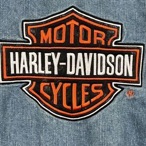 Gently used Harley-Davidson Denim Jacket… all buttons say Harley-Davidson, leather patch on back bottom. Full sized embroidered shield on back. Small patch on front. Similar cut to a Levi’s jacket.