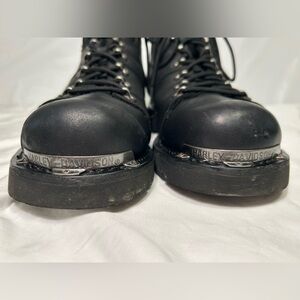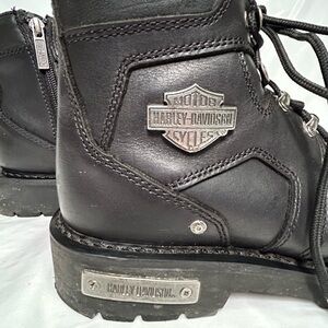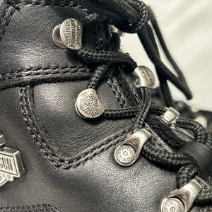 Rugged black leather boots with lace-up design. Features Harley-Davidson logo. Ideal for tough wear.