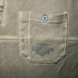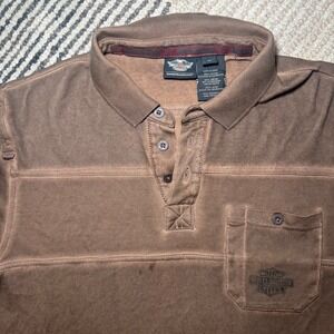 This Harley-Davidson men's polo shirt in brown features a rugged biker look with a front pocket, embossed Harley logo, and faded wash for a vintage vibe. Made from 100% cotton for comfort, it's styled with a three-button placket, short sleeves, and Harley-Davidson graphic detailing on the back.