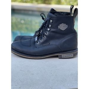 Harley-Davidson Men's Clancy Waterproof Black Motorcycle Boots M-10. Men's riding leather motorcycle boots or fashion boots. D96159. The boots have silver hardware, with a smooth round toe, lacing is accomplished using a combination of traditional Harley logo eyelets and speed hooks. A metal Harley-Davidson badge is on the bottom lace, and an affixed one on the outside of the shaft, and a black "Waterproof" fabric badge is sewn onto an outside seam for quick identification. Additional metal badging is on the outside face of the heel. A reinforcing leather panel is on the smooth round toe to resist wear caused by shifting gears. With YKK locking inside zippers, the boots are easy to put on and take off. The boots are made with waterproof full-grain leather with a breathable waterproof membrane lining- so your feet stay warm and dry in all weather conditions. The boot's sole, insole and upper are bound using resoleable Goodyear Welt construction method processes. Simulated leather with rubber street side outsoles, provide a good look and a soft and easy stride. The street side instep has a Bar & Shield logo. Shaft height: 5.5", Heel height: 1.25". Barely worn, like new.