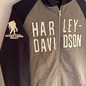 Genuine Harley Davidson full zip hoodie. Men’s size medium. Wounded warrior project logo on upper sleeve and back proudly displays the American flag with “believe in heroes”. Great condition