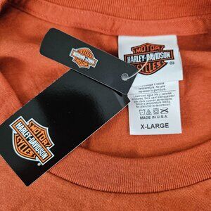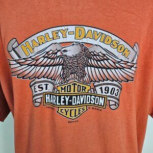 Feel the spirit of the open road with this Harley-Davidson tee, combining vibrant orange tones with bold imagery. Featuring iconic Myrtle Beach graphics, it celebrates the freedom of riding. Its comfortable cotton fabric and relaxed fit make it a great companion for all your adventures.