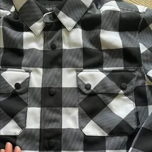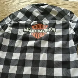Stylish Harley-Davidson jacket with a black and white checkered pattern. Features the iconic logo on the back. Front zipper hidden by snap placket.
