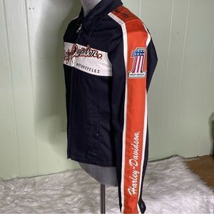 Left sleeve a number "1" with "Harley Davidson" stiched on patch, as well as stiched up sleeve. Right sleeve has "Harley Davidson Motorcycle" patch as well as Harley Davidson stitching up sleeve. Satin lining
