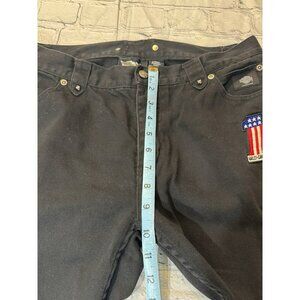 The Harley-Davidson Motorcycles Woman's Bootcut Denim Black Embroidered Riding Jeans in size 12 are a stylish and patriotic Patch Edition pair of jeans perfect for motorcycle enthusiasts. Made of cotton denim with embroidered accents, these bootcut jeans feature the Harley-Davidson brand logo and offer a regular fit. They come in classic black with pockets for added functionality. This piece combines fashion with a motorcycle theme, making it a great choice for women looking for both style and comfort while riding or casually wearing. In great used condition no wear.